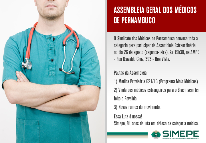 O Simepe convoca toda a categoria médica para participar de Assembleia Geral de caráter deliberativo, segunda-feira, 26 de agosto, às 19h30, no auditório da Associação Médica de Pernambuco (AMPE), Boa Vista.