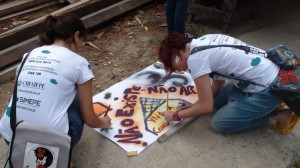 Em frente ao posto de saúde, foi realizada a oficina de pintura e grafitagem com a mediação dos grafiteiros Caju e Leo. A princípio tímidos, os membros da comunidade acabaram se rendendo à arte. Foram atraídos pelo som improvisado colocado pelos caravaneiros no local e pelas cores das tintas; ajudando, inclusive, na montagem do espaço da oficina.