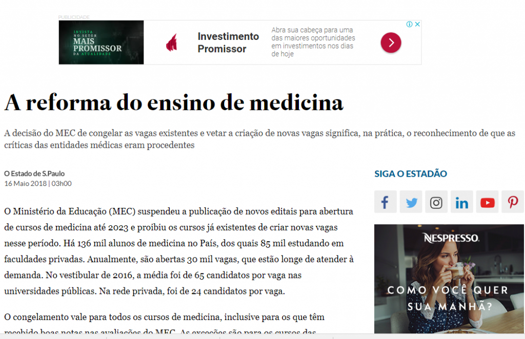 Com entrevistas om Dr Raul Cutait, da USP, e Lincoln Lopes Ferreira, presidente da AMB, a reportagem do Estadão de hoje (16/05/2018) faz uma análise das necessidades que levaram a assinatura da portaria do Ministério da Educação (MEC) que suspendeu a publicação de novos editais para abertura de cursos de medicina até 2023 e proibiu os cursos já existentes de criar novas vagas nesse período.