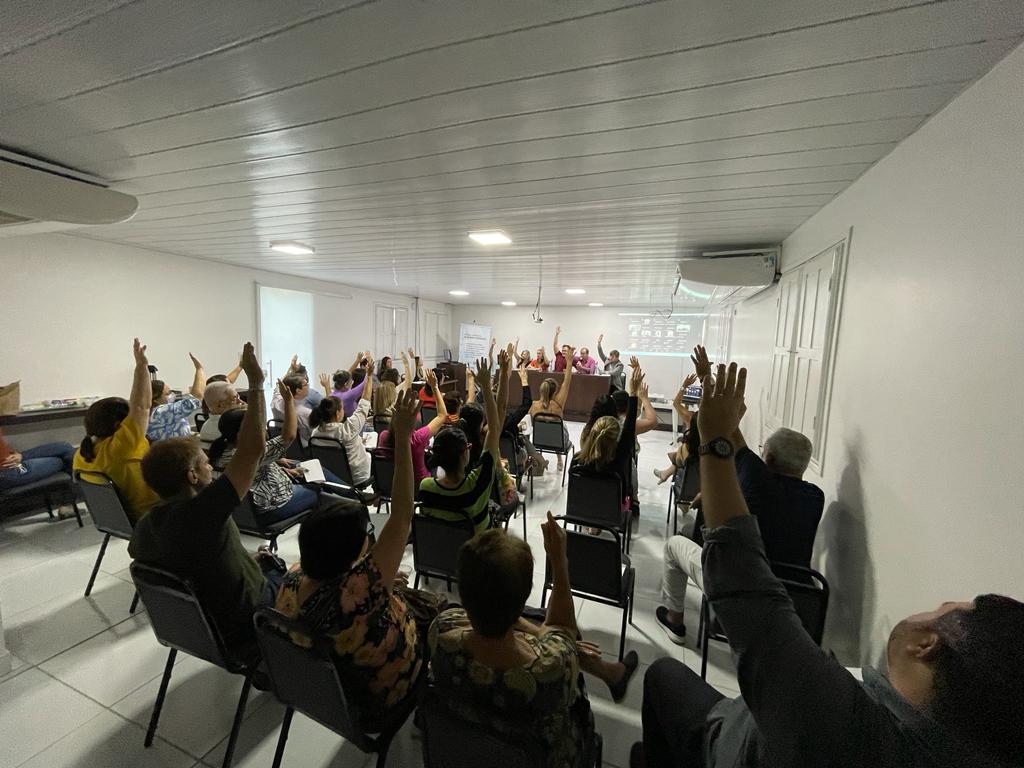 Na AGE, realizada no auditório do Simepe, estiveram presentes a secretária-geral, Cláudia Beatriz, a secretária de assistência ao associado, Malu David, além dos diretores Rodrigo Rosas, Fernando Junior, Lilian Parra e Tadeu Calheiros (vereador do Recife).
