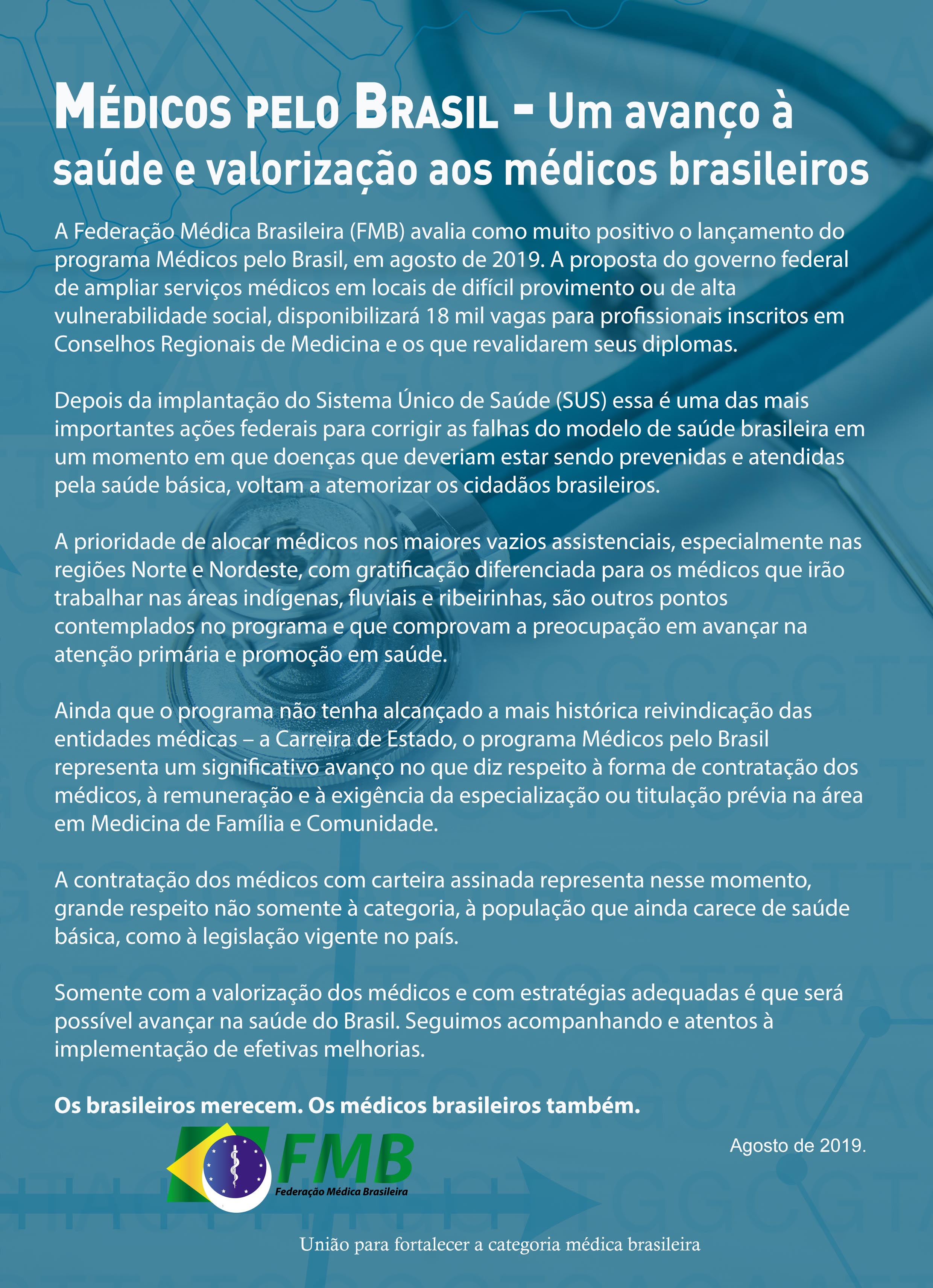 A Federação Médica Brasileira (FMB) avalia como muito positivo o lançamento do programa Médicos pelo Brasil, em agosto de 2019. A proposta do governo federal de ampliar serviços médicos em locais de difícil provimento ou de alta vulnerabilidade social, disponibilizará 18 mil vagas para profissionais inscritos em Conselhos Regionais de Medicina e os que revalidarem seus diplomas.