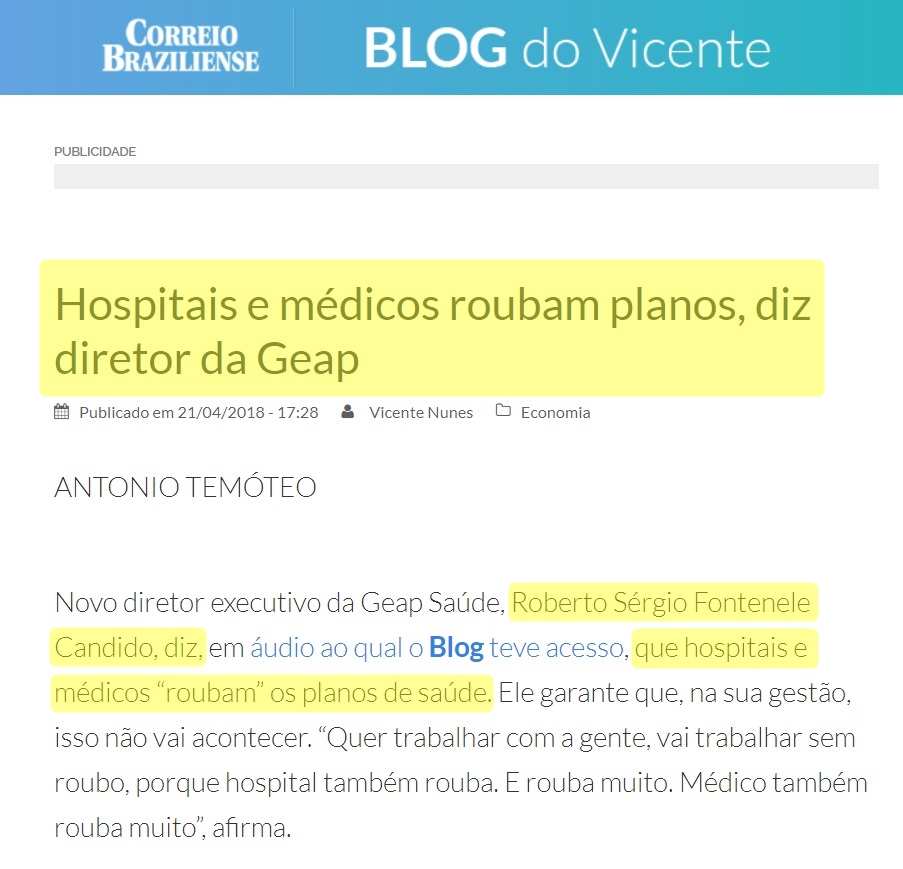 No áudio dentro da matéria https://soundcloud.com/correio-braziliense/posse-de-gerentes-da-geap-no-distrito-federal, que tem duração de 16 minutos, o diretor diz que “Quem quer trabalhar com a gente, vai trabalhar sem roubo, porque hospital também rouba. E rouba muito. Médico rouba muito”, afirmou. Os supostos “roubos” se dariam por meio de superfaturamento de preços de serviços de procedimentos médicos, os quais por vezes não seriam nem ao menos prestados pelos profissionais.