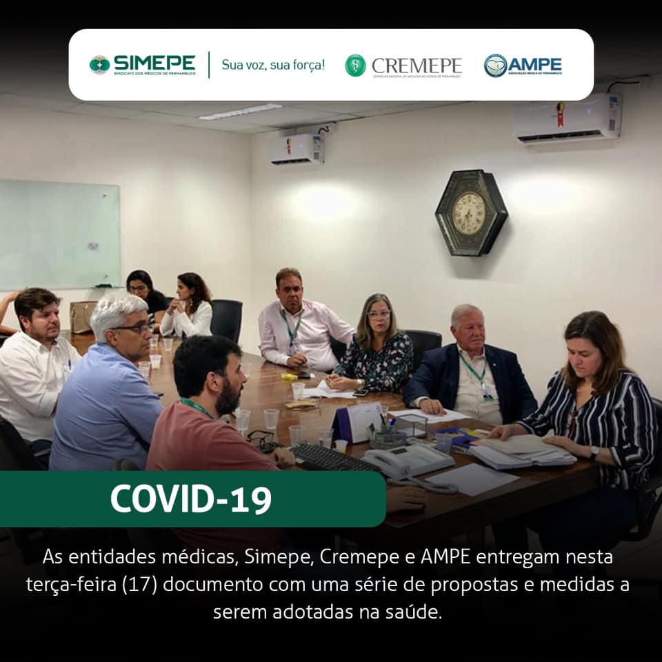 As entidades médicas, Simepe e Cremepe, entregam nesta terça-feira (17) documento com uma série de propostas e medidas a serem adotadas na saúde do estado para garantir maior proteção da sociedade e dos profissionais da saúde.