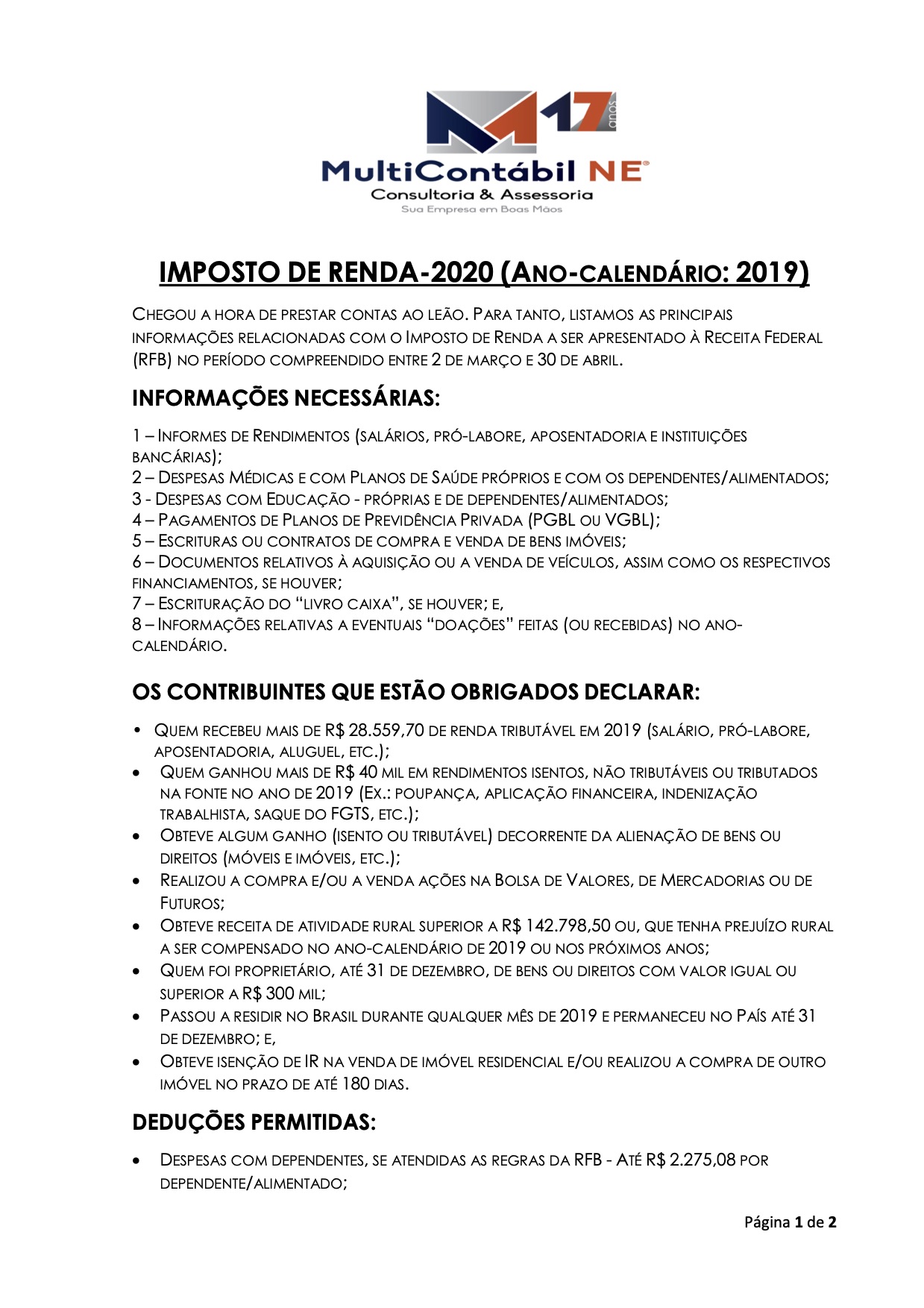 Já está valendo o prazo para o envio das Declarações do Imposto de Renda das Pessoas Físicas. Neste período, o médico associado poderá contar com os serviços da MultiContábil do Nordeste, nova parceira do Clube Simepe e que tem grande expertise neste tema. Para ter acesso ao serviço, os associados interessados devem se dirigir à sede do Simepe para retirada de encaminhamento ao benefício e outras orientações importantes.