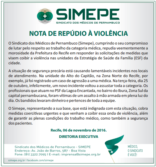 O Sindicato dos Médicos de Pernambuco (Simepe), cumprindo o seu compromisso de lutar pelo respeito ao trabalho da categoria médica, repudia veementemente a morosidade da Prefeitura do Recife em responder às solicitações de medidas que visem coibir a violência nas unidades da Estratégia de Saúde da Família (ESF) da cidade.
